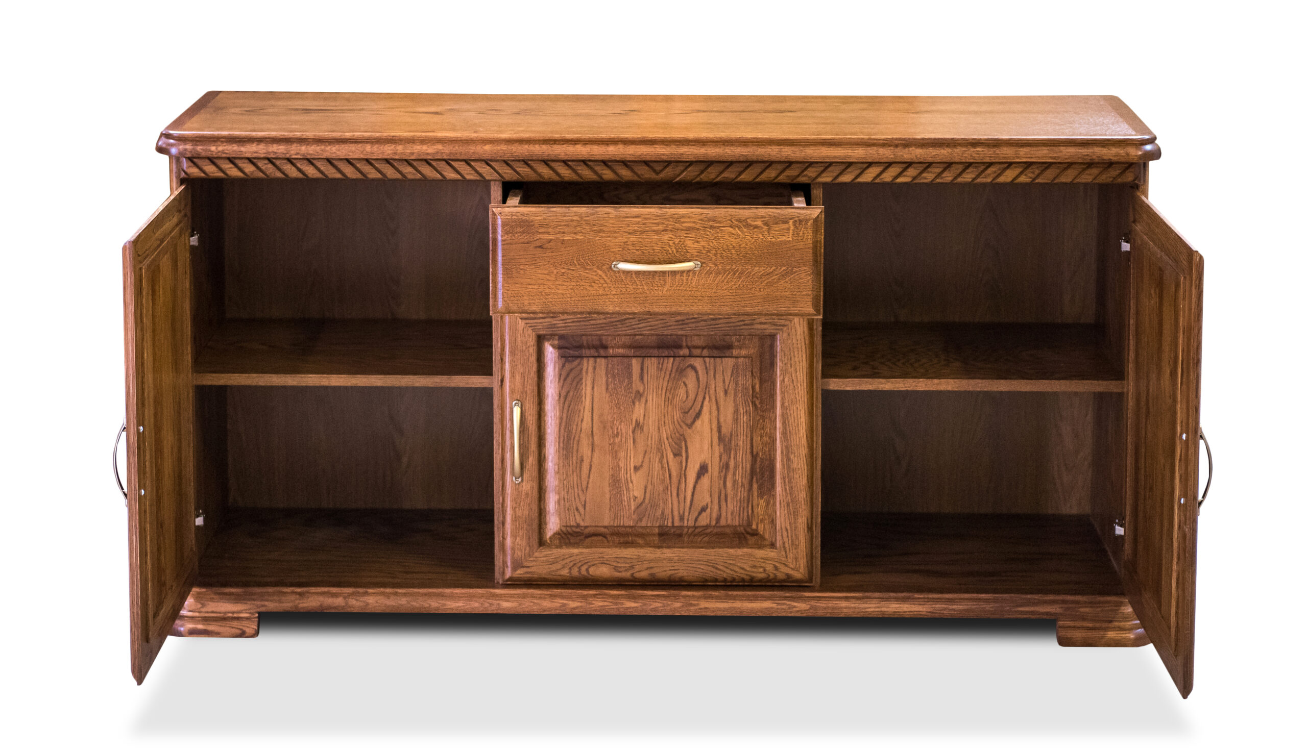 Środkową część stanowi szuflada i funkcjonalny barek, które idealnie nadają się do przechowywania różnych drobiazgów. Boczne komory wyposażone są w jedną półkę i zamykane drzwiczkami.