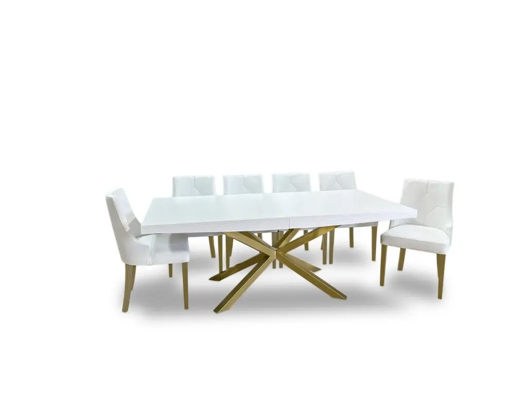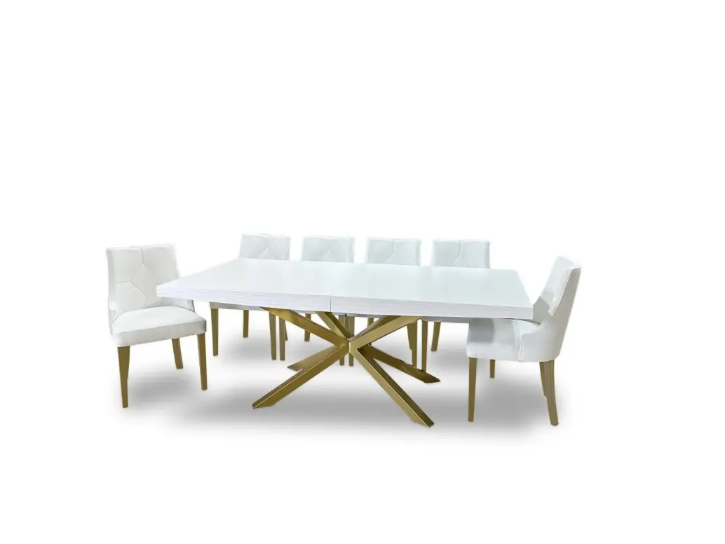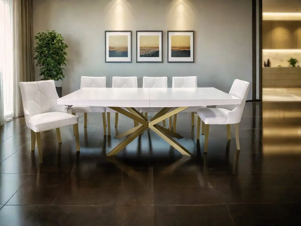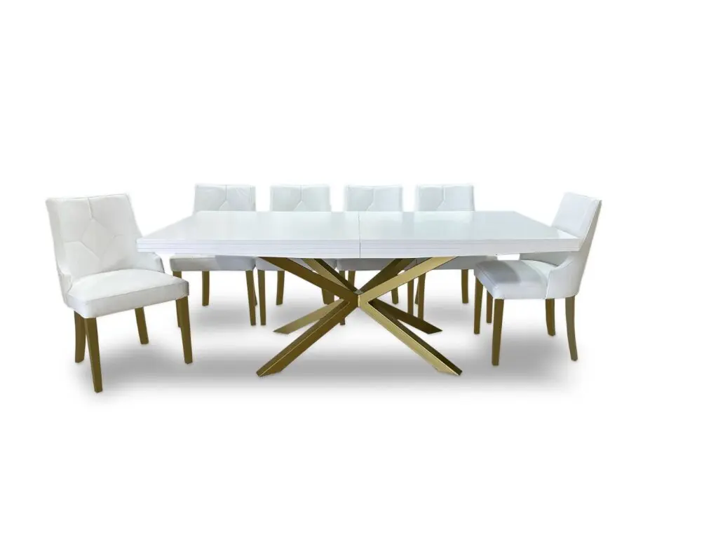 Stół SJ50 to piękny drewniany stół z mocną podstawą ze złotego metalu w kształcie pająka. Kolejną jego cechą jest możliwość wydłużenia o 90 cm za pomocą dwóch dodatkowych wkładek po 45 cm.